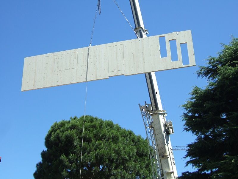 La struttura in X-lam è invece costituita da pareti piene in legno realizzate incollando tra loro tavole di conifera fino ad ottenere gli spessori necessari, e facendo proprio il concetto della prefabbricazione, è studiata in modo da far arrivare in cantiere gli elementi già pronti per il loro montaggio riducendo notevolmente il tempo di cantierizzazione dell’opera.